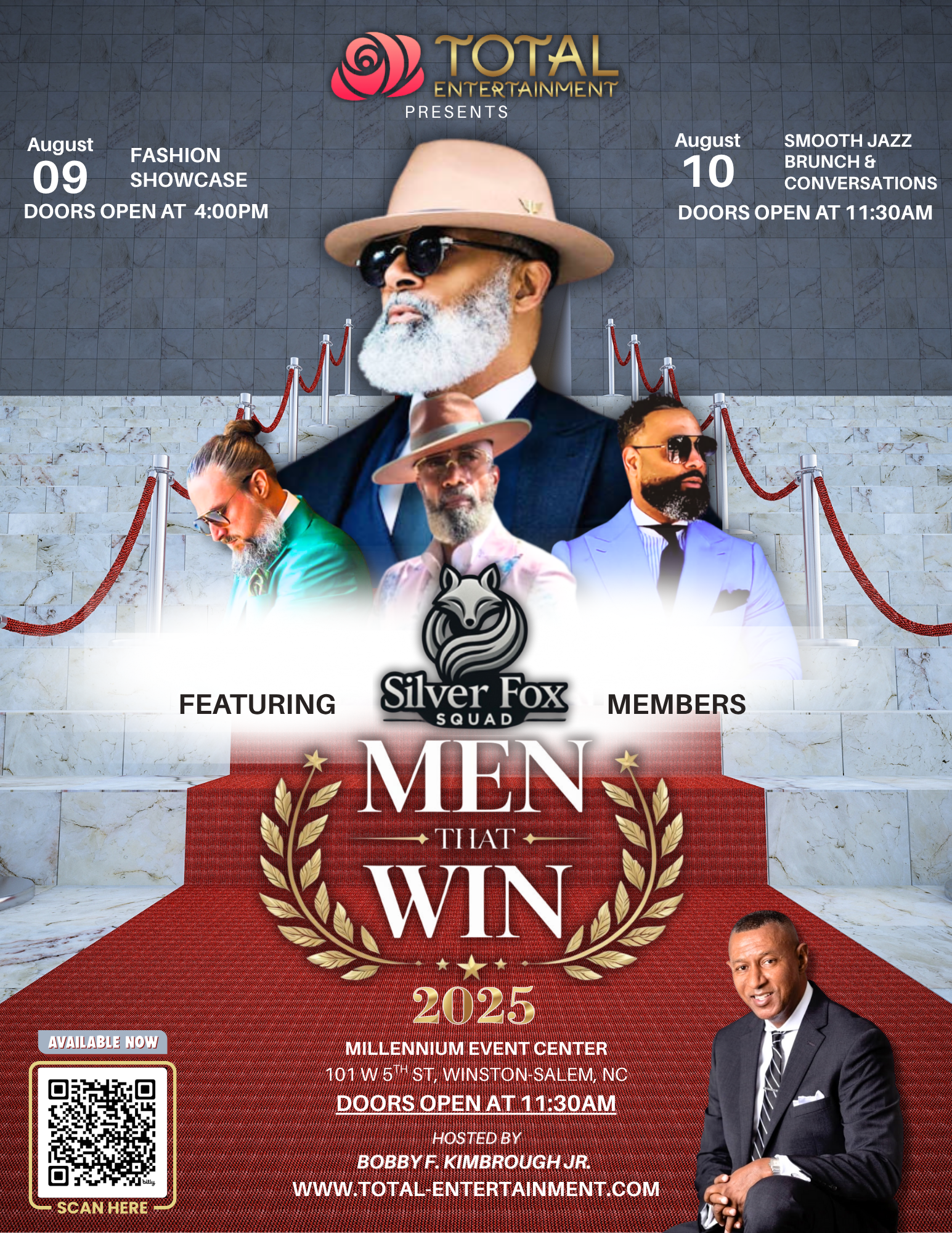 TOTAL ENTERAINMENT PRESENTS - MEN THAT WIN. ENJOY SMOOTH JAZZ, BRUNCH AND CONVERSATIONS WITH SILVER FOX SQUAD MEMBERS IRVIN RANDLE, KYLE ‘PUSH’ DUTCHER, WINSTON WARRIOR, AND MICHAEL JOHNSON. HOSTED BY BOBBY F. KIMBOROUGH JR.
